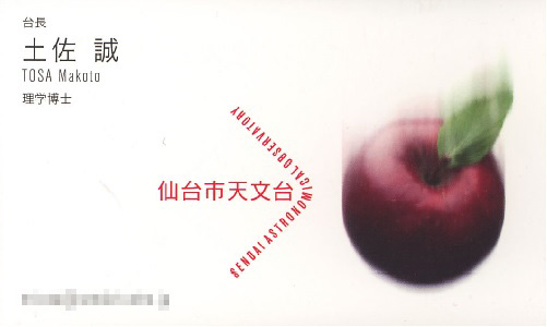 私の名刺の表には、左上に名前と肩書き、下の端に小さな文字で1行メールアドレスが印刷されています。活字はそれだけですが、中央に仙台市天文台の矢印型ロゴ(VI=Visual Identityと言います)とその矢印の先にピンボケの赤いリンゴが印刷されています。名刺を見て怪訝な顔をされる方が多いのですが、「きれい、すてきな名刺ですね」とお世辞を言ってくれる方もあります。