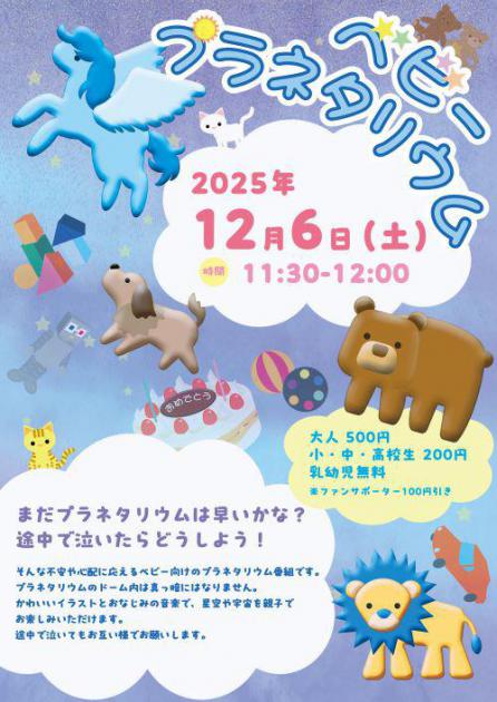 まだプラネタリウムは早いかな?途中で泣いたらどうしよう!そんな不安や心配に応えるベビー向けのプラネタリウム番組です。プラネタリウムのドーム内は真っ暗にはなりません。 かわいいイラストとおなじみの音楽で、星空や宇宙を親子でお楽しみいただけます。途中で泣いてもお互い様でお願いします。