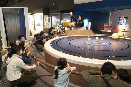 展示室で、月食中の月が赤く見える理由を解説します。