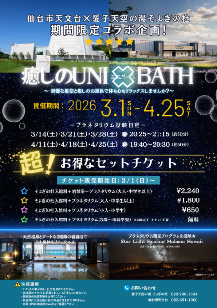 | 場所 | 愛子天空の湯そよぎの杜/仙台市天文台プラネタリウム |