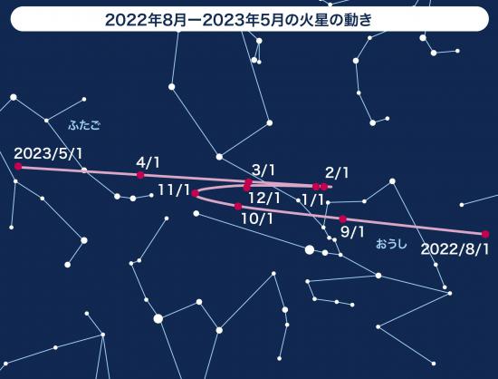 最接近となる12月1日前後、火星は冬の星たちのなかで輝きます。周りに似たような色の星もありますが、赤っぽい色を目印にして火星を見つけてみましょう。