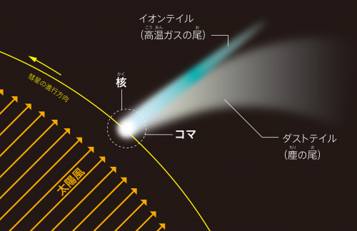 彗星が太陽から遠いときには、尾はありません。およそ地球の軌道程度の距離(約1.5億km)まで太陽に近づくと、太陽の熱によって彗星の核が昇華してガスや塵が吹き出します。このガスや塵が太陽風に吹き飛ばされることで尾ができます。